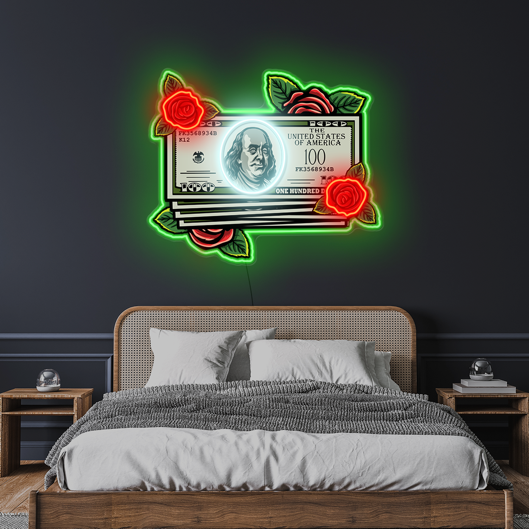 Make it rain with our Money Plant neon sign! Featuring a design that combines $100 dollar notes with beautiful rose flowers, this sign is the perfect addition to any space that needs a little extra financial flair. Hang it up in your financial office, business, or even your home, and let the energy-efficient LED lights light up your space without putting a dent in your wallet.